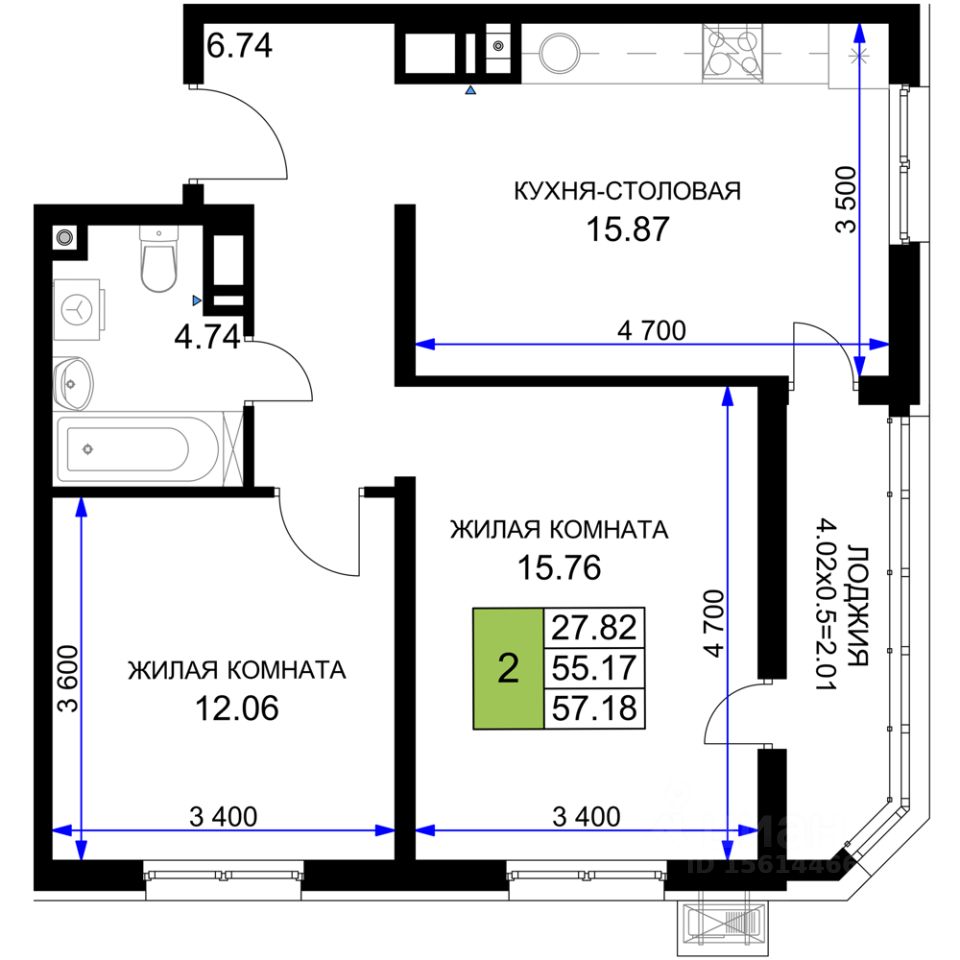 Общая площадь57,18 м²
