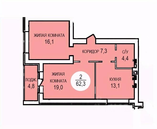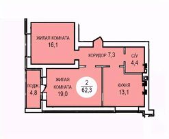 В квартире хорошие комнаты: большая 19 кв м с выходом на лоджию 4,8 кв м и вторая 16,1 кв м. Можно утеплить лоджию и сделать зону отдыха, небольшой кабинет или будуар. Лоджия будет с панорамным остеклением. Санузел 4,4 кв м. Хорошая кухня 13,1 кв м, всем хватит места.