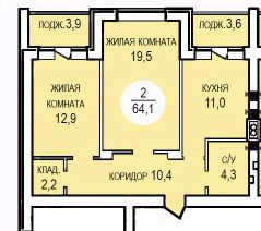 В квартире большая комната 19,5 кв м и вторая 12,9 кв м с выходом на лоджию 3,9 кв м. Можно утеплить лоджию и сделать зону отдыха, небольшой кабинет или будуар. Санузел 4,3 кв м. Кухня 11 кв м и из кухни выход на вторую лоджию 3,6 кв м, что дает возможность увеличить полезную зону, сделать уютное место для чаепития, разработать систему хранения, посадить цветы. В квартире есть кладовая 2,2 кв м для нужных и не очень вещей.