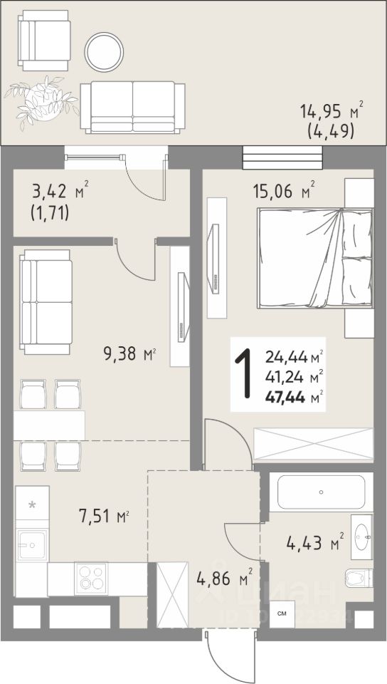 Продается 1-комнатная квартира площадью 47,44 кв. м на 3 этаже в новом современном клубном квартале от строительной компании "КОНТИНЕНТ ГРУПП".