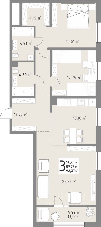 Продается 3-комнатная квартира площадью 92,37 кв. м на 3 этаже в новом современном клубном квартале от строительной компании "КОНТИНЕНТ ГРУПП".