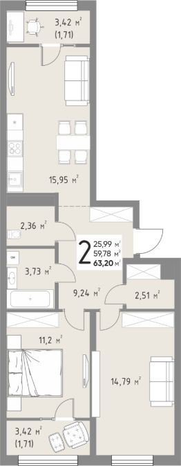 Продается 2-комнатная квартира площадью 63,2 кв. м на 4 этаже в новом современном клубном квартале от строительной компании "КОНТИНЕНТ ГРУПП".