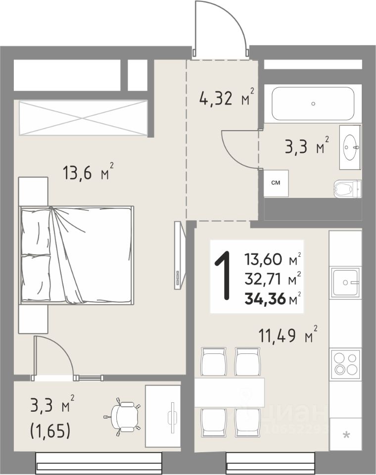 Продается 1-комнатная квартира площадью 34,36 кв. м на 8 этаже в новом современном клубном квартале от строительной компании "КОНТИНЕНТ ГРУПП".