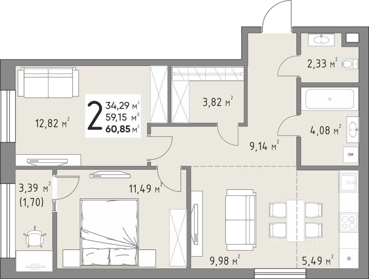 Продается 2-комнатная квартира площадью 60,85 кв. м на 3 этаже в новом современном клубном квартале от строительной компании "КОНТИНЕНТ ГРУПП".