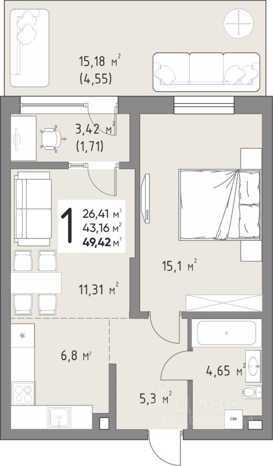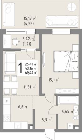 Продается 1-комнатная квартира площадью 49,42 кв. м на 3 этаже в новом современном клубном квартале от строительной компании "КОНТИНЕНТ ГРУПП".