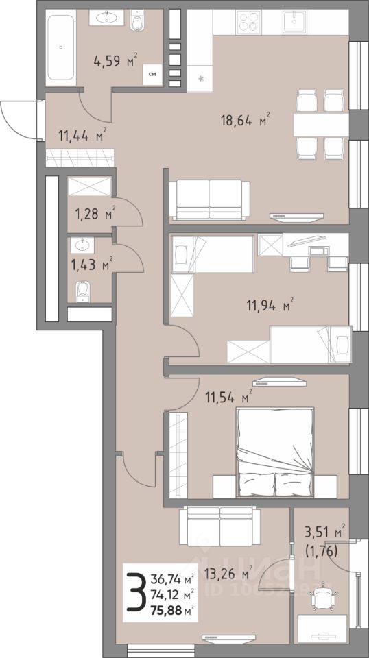 Продается 3-комнатная квартира площадью 75,88 кв. м на 5 этаже в новом современном клубном квартале от строительной компании "КОНТИНЕНТ ГРУПП".