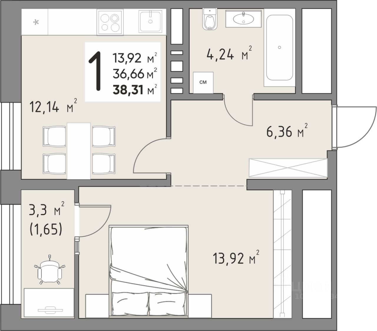 Продается 1-комнатная квартира площадью 38,31 кв. м на 5 этаже в новом современном клубном квартале от строительной компании "КОНТИНЕНТ ГРУПП".