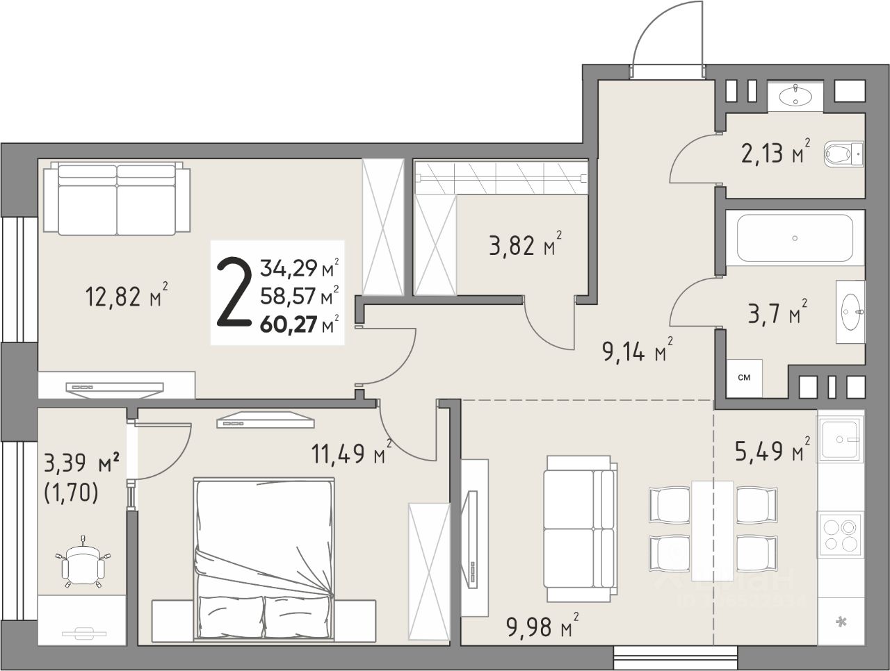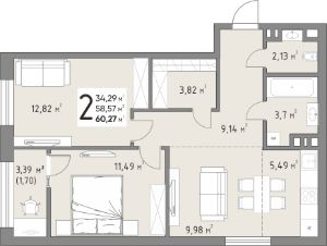 Продается 2-комнатная квартира площадью 60,27 кв. м на 7 этаже в новом современном клубном квартале от строительной компании "КОНТИНЕНТ ГРУПП".