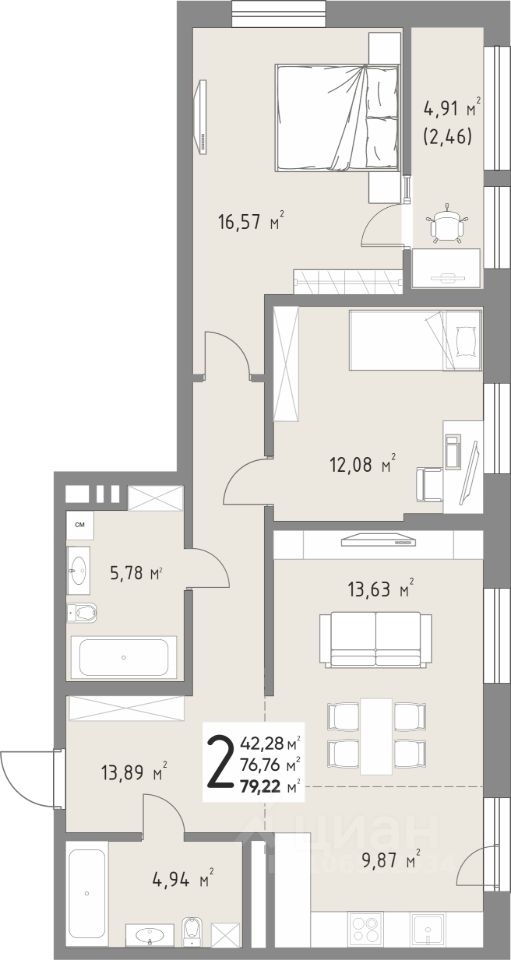 Продается 2-комнатная квартира площадью 79,22 кв. м на 9 этаже в новом современном клубном квартале от строительной компании "КОНТИНЕНТ ГРУПП".