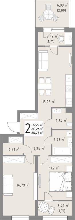 Продается 2-комнатная квартира площадью 65,77 кв. м на 3 этаже в новом современном клубном квартале от строительной компании "КОНТИНЕНТ ГРУПП".