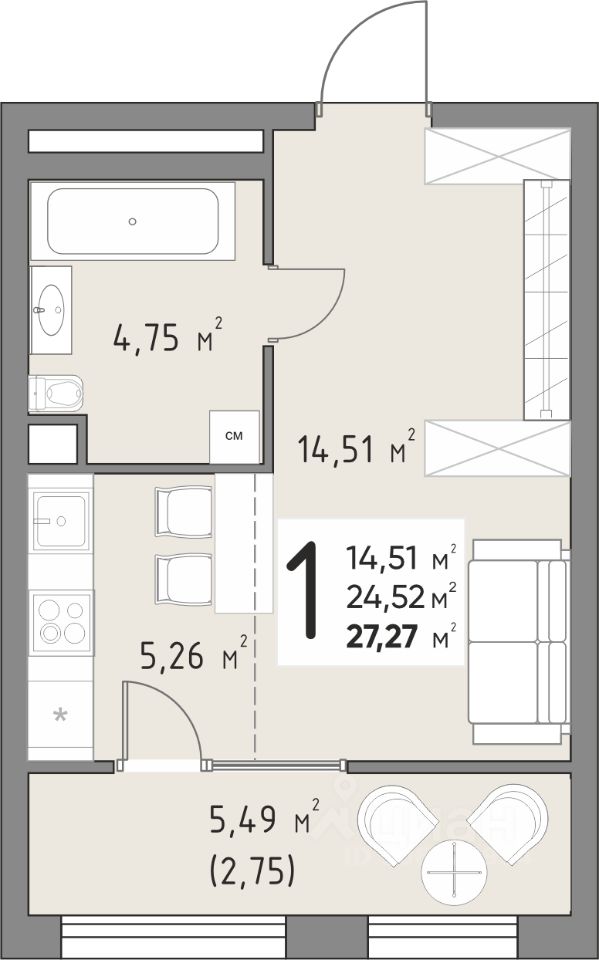 Продается 1-комнатная квартира площадью 27,27 кв. м на 3 этаже в новом современном клубном квартале от строительной компании "КОНТИНЕНТ ГРУПП".