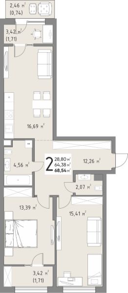Продается 2-комнатная квартира площадью 68,54 кв. м на 3 этаже в новом современном клубном квартале от строительной компании "КОНТИНЕНТ ГРУПП".