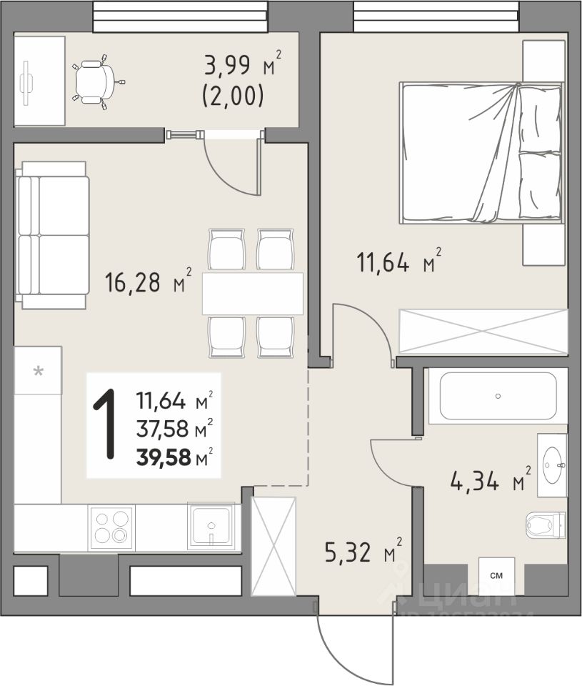 Продается 1-комнатная квартира площадью 39,58 кв. м на 7 этаже в новом современном клубном квартале от строительной компании "КОНТИНЕНТ ГРУПП".
