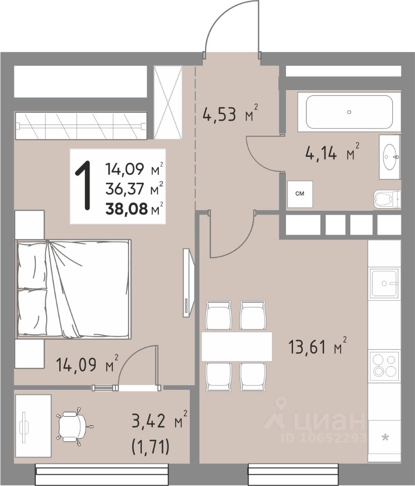 Продается 1-комнатная квартира площадью 38,08 кв. м на 11 этаже в новом современном клубном квартале от строительной компании "КОНТИНЕНТ ГРУПП".
