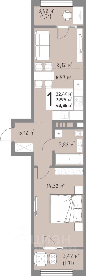 Продается 1-комнатная квартира площадью 43,35 кв. м на 12 этаже в новом современном клубном квартале от строительной компании "КОНТИНЕНТ ГРУПП".