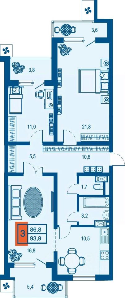 квартира с комнатами на 2 стороныиз спальни вид на озероиз двух спален и кухни вид во дворраздельный санузелв коридоре есть место для гардеробнойесть возможность объединения комнаты и кухни3 балкона