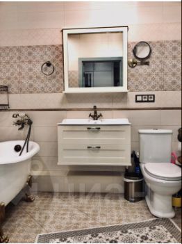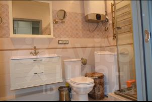 Санузел - 5,6кв.м: итальянская плитка, ванна из искусственного камня, душевая кабина, бронзовые итальянские смесители, водонагреватель 50л, стиральная машина , раковина с тумбой и зеркалом.