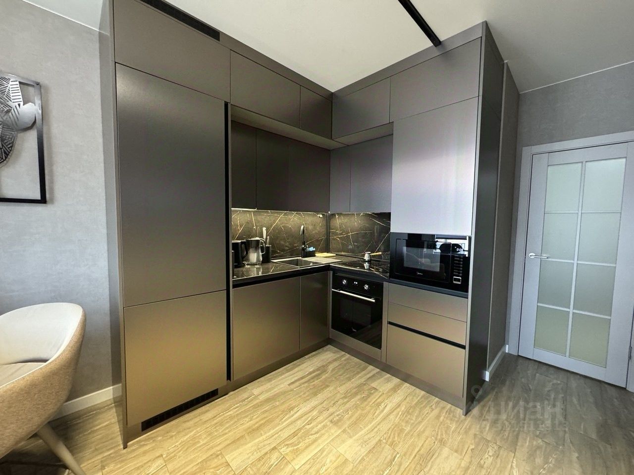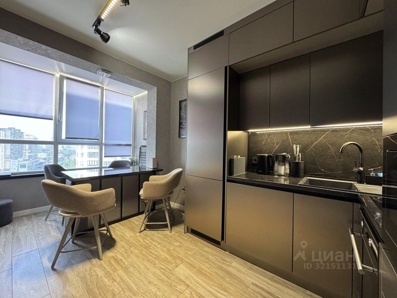 Вся мебель остается, изготавливалась индивидуально под дизайн квартиры, даже картины сделаны из качественных материалов и отлично вписываются в интерьер. Мебель установлена таким образом, чтоб робот пылесос все мог очистить без преград. Вся техника тоже новая остается. Сплит системы подключаются к смартфону.