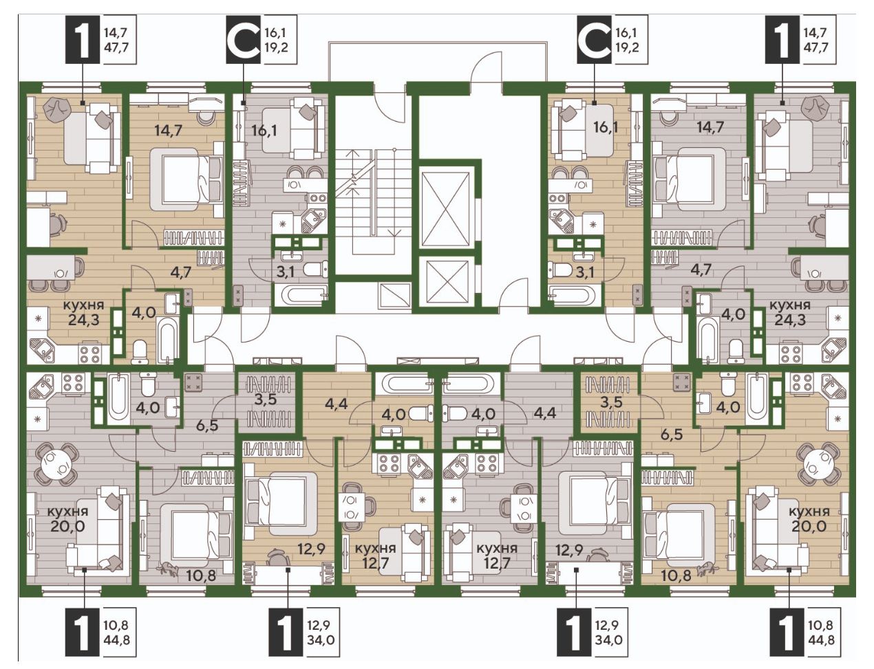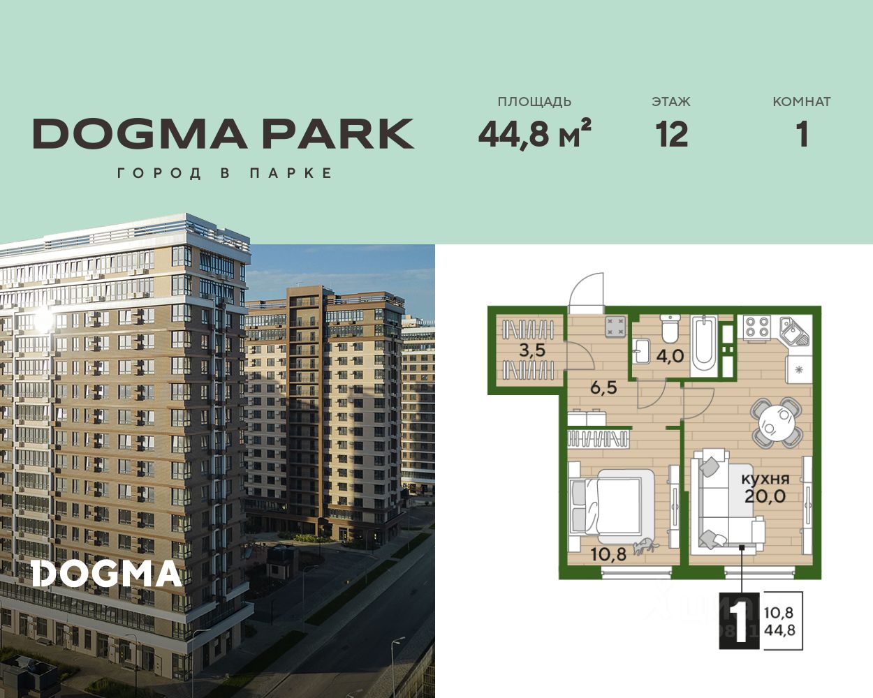 В продаже 1-комнатная квартира от застройщика! Мкр. "DOGMA PARK" г. Краснодар, Литер 23 Срок сдачи: 4 кв. 2027, общей площадью 44.8 кв.м., на 12 этаже.