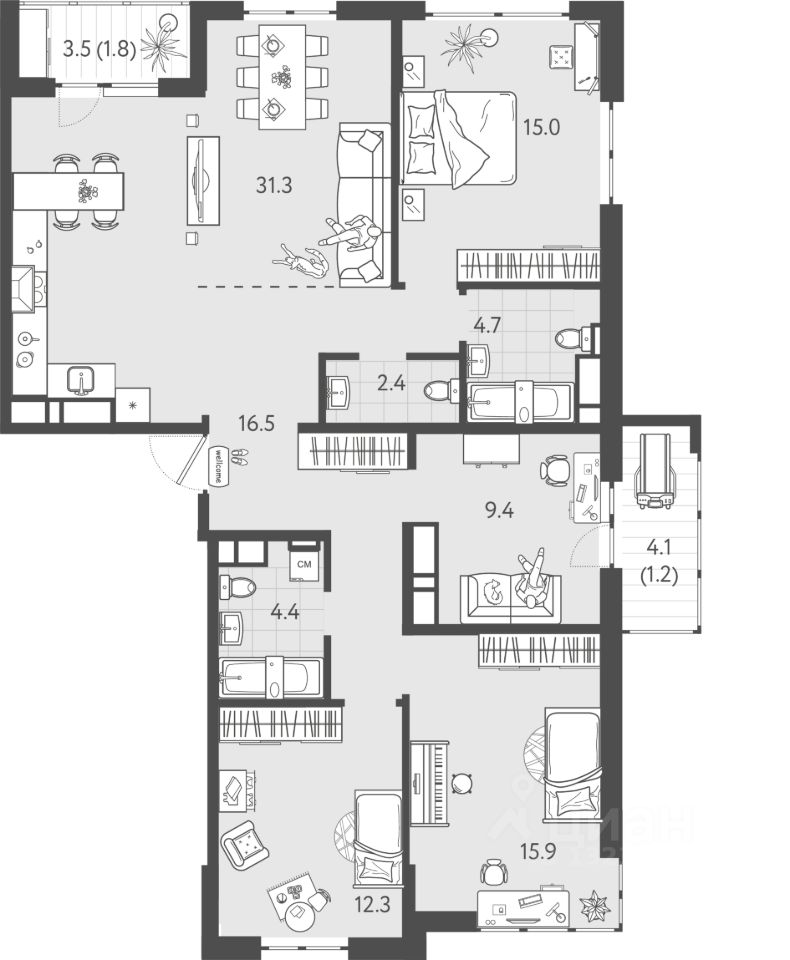 Продаётся 4-комнатная квартира в сданном доме (Литер 8), срок сдачи: III-кв. 2024, общей площадью 114.99 кв.м., на 24 этаже. Добрососедский квартал "Все свои"