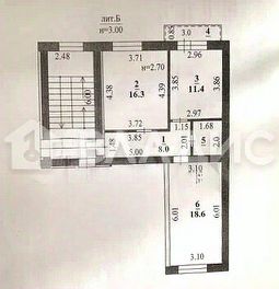 Общая площадь 57,7 кв.м, комната 16,3 кв.м, комната 18,6 кв.м, кухня 11,4 кв.м, коридор 8 кв.м, совмещенный санузел в кафеле 3.36 кв.м , балкон стеклён 2,55 кв.м