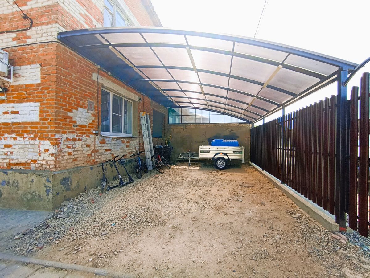 Прилегающая территория включает 3 сотки земли, удобные хозяйственные постройки и большой навес для авто.
