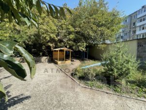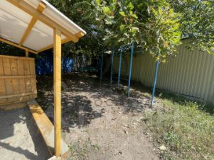 Закрытая территория дома с шлагбаумом, парковочными местами, большой беседкой и детской площадкой.