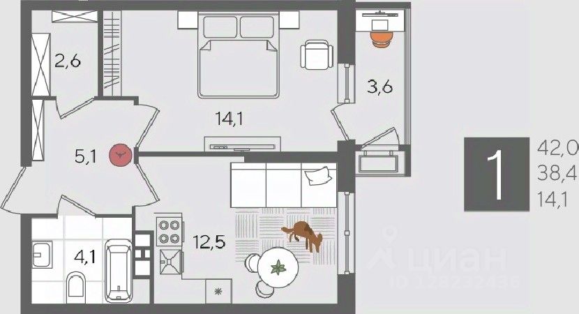 В продаже 1-комнатная квартира от застройщика! ЖК "Рекорд", г. Краснодар, Литер 5, общей площадью 42 кв.м., на 3 этаже.