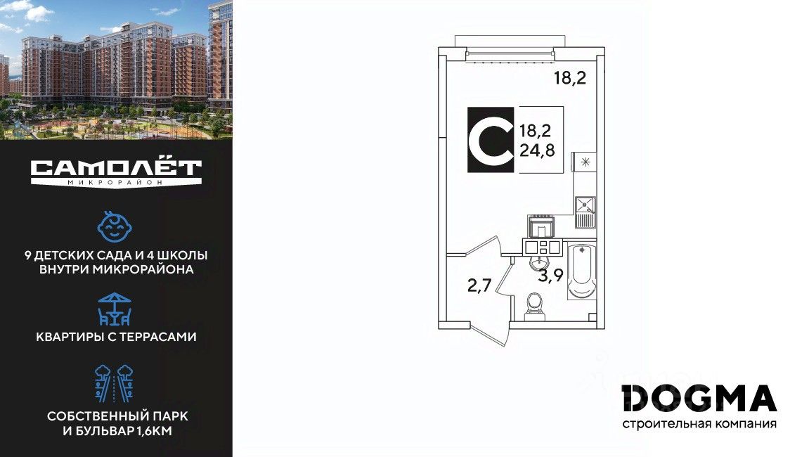 DOGMA - ТОП-3 застройщик по объему строительства в РФ. "САМОЛЁТ" — концептуальный жилой микрорайон, который расположен на северо-западе Краснодара, в районе Западного Обхода. Квартал спроектирован как "город в городе", поэтому здесь будет всё для комфортной жизни: современные дома с разными планировками, дороги, школы и детские сады, поликлиника, торговые центры, парки и аллеи. Микрорайон находится далеко от промышленных предприятий, сочетает удобство городской жизни и экологически благоприятную среду. Инфраструктура нового микрорайона: • 4 школы и 9 детских садов на территории микрорайона • Функциональные планировки • Собственный бульвар протяжённостью 1,6км • Светомузыкальный фонтан протяжённостью 55 метров • Амфитеатр • Парк 7 ГА • Скейт-парк • Детская аква-площадка • Круглосуточное видеонаблюдение и пост охраны Приобрести квартиру можно одним из способов: ипотека, рассрочка, наличный расчет.