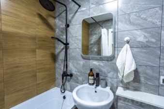 • Совмещённый санузел в нейтральных тонах.