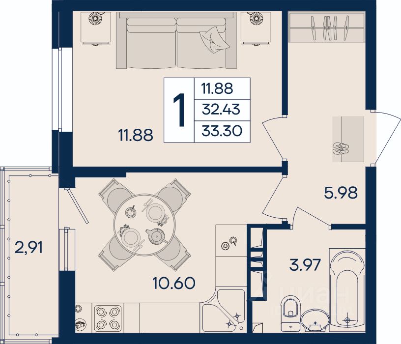 1 комнатная квартира 33.3 м² с ремонтом, на 5 этаже в жилом комплексе "Дом 101".