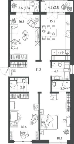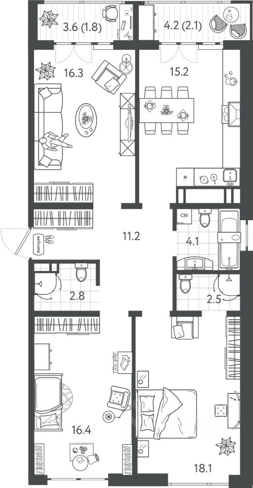 130 планировочных решений квартир с мастер-спальными, гардеробными и огромными лоджиями."Все Свои VIP" — настоящий бастион с тремя уровнями безопасности, доступом по Face ID и системой "Умный дом".