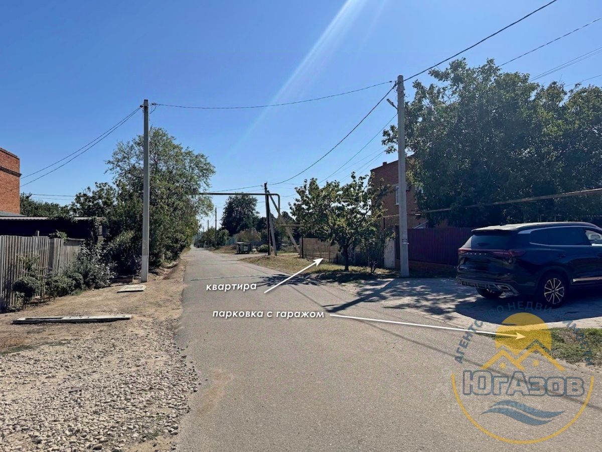 Выход в свой двор, квартира угловая, так же рядом с квартирой располагается приватизированный участок с гаражом. Прилегающая дорога-асфальт, рядом детская площадка, школа, магазин, дет сад. До берега моря 1 км.