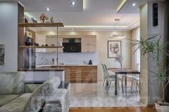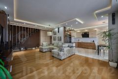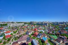 Квартира состоит из двух уровней, идеально подойдёт для семей с детьми. На первом этаже огромная кухня-гостиная, гостевая и детская спальни, душевая, санузел и гардеробная. На втором этаже просторная ванная комната, хозяйская спальня с большой гардеробной и кабинетом. Из окон квартиры открывается отличный вид на весь центр Краснодара.