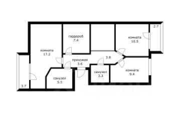 Планировка квартиры: кухня-гостиная 34,8м2, 3 изолированные комнаты , 2 санузла, большая гардеробная.