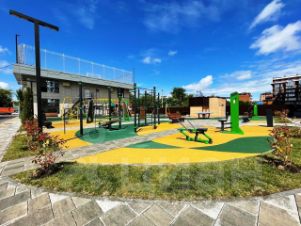 Отдельного упоминания заслуживает детская площадка комплекса. Экологически чистая площадка, деревянные горки, скамейки, органично вписанные в стилистику качели. В центре - площадки для игр и развития детей, спортивный корт и уличные тренажёры для занятий легкой атлетикой и воркаутом.