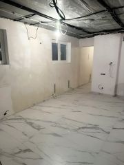 Полы были демонтированы до основания, залита новая стяжка и проложен теплый пол по всей квартире, уложен керамогранит.
