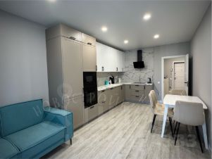 Просторная кухня-гостиная 19.1 м2. Встроенная кухня укомплектована: холодильник, посудомоечная машина, микроволновая печь, вытяжка, духовой шкаф. Диван раскладывается (доп. спальное место), телевизор.