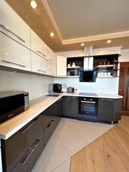 Детали: Мебель выполнена на заказ в Германии, кухня оборудована техникой Bosch, изысканные кожаные элементы в спальне и гостиной. Эксклюзивные материалы отделки подчеркивают статус объекта.