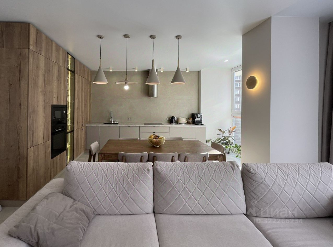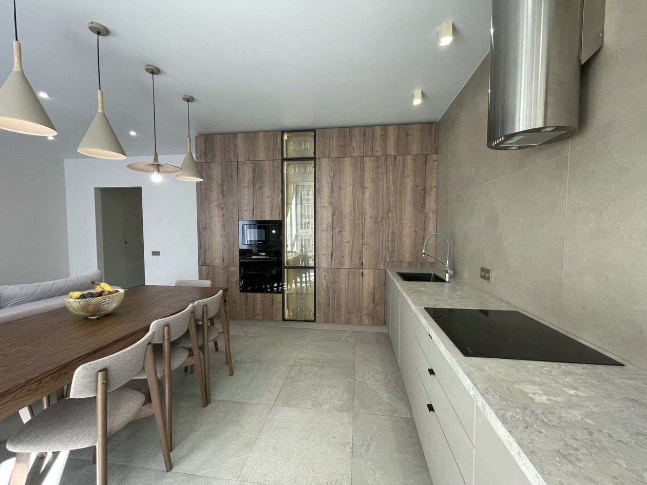 Здесь есть все необходимое: встроенные холодильник, посудомоечная машина, духовой шкаф и микроволновая печь. Есть модная вертикальная круглая вытяжка, внутрипольный отопительный конвектор. Сквозь панорамные окна открывается красивый вид на детский сад. На каждой оконной створке установлены жалюзи - рулонные шторы.