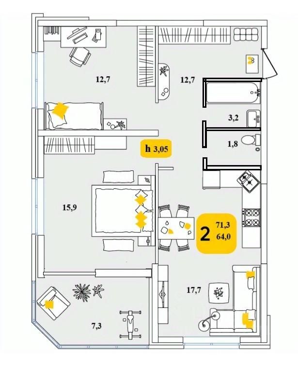 ПРОДАЁТСЯ БОЛЬШАЯ ДВУХКОМНАТНАЯ КВАРТИРА В ЖИЛОМ КОМПЛЕКСЕ ТИТАНЫ
