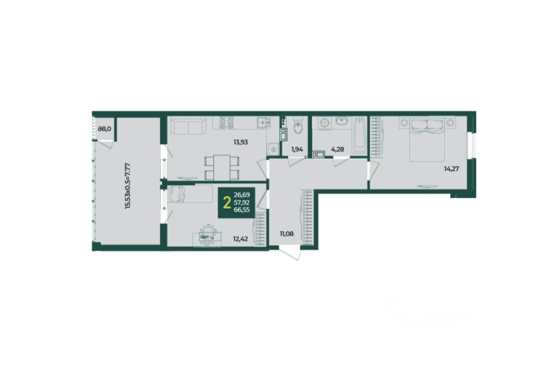 В продаже стильная 2 комнатная квартира с большой кухней 13.93м2 с выходом на ленточную лоджию 15.53м2, прихожая 11.08 м2 с зоной для гардероба.