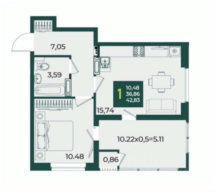 В продаже стильная 1'комнатная квартира с большой лоджией площадью 10.22 м2 и кухней-гостинной 15.74 м2. Квартира отличается функциональной планировкой, что делает ее идеальным вариантом для комфортной жизни.