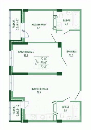 Удобная и функциональная планировка с двумя санузлами и просторной кухней-гостиной!