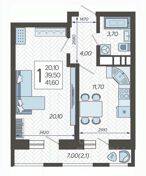 Выполнена предчистовая отделка: выровнены стены и потолки, проведены электропроводка и коммуникации, подготовлено основание под финальную отделку. Из окон открывается вид на парк имени 300-летия полиции России.
