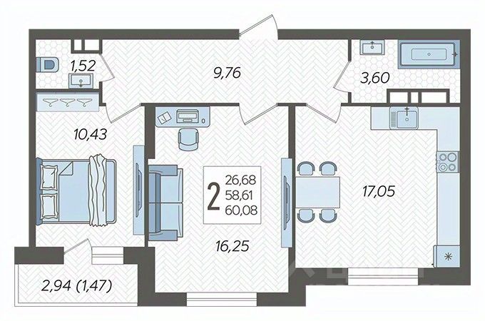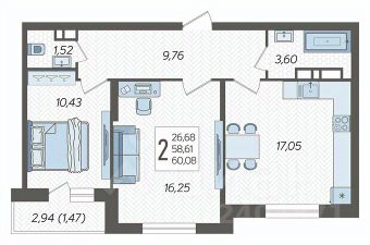 В продаже двухкомнатная квартира с большой кухней-гостиной!