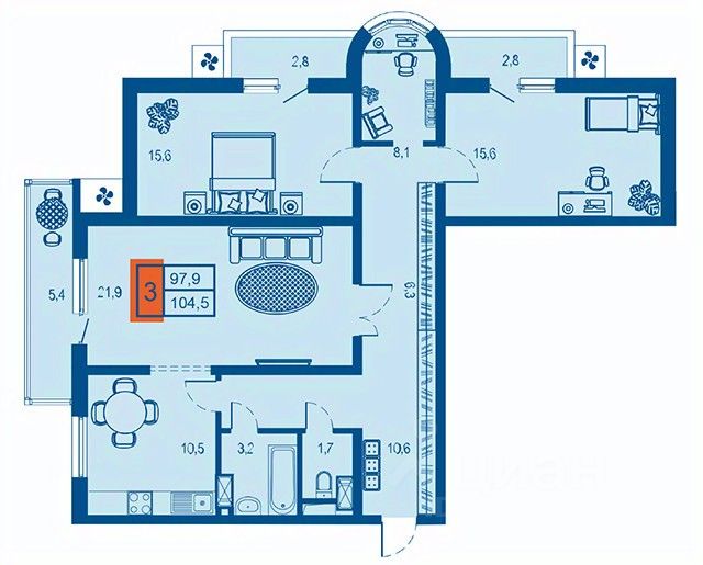 Трёхкомнатная квартира с планировкой на 2 стороны света.