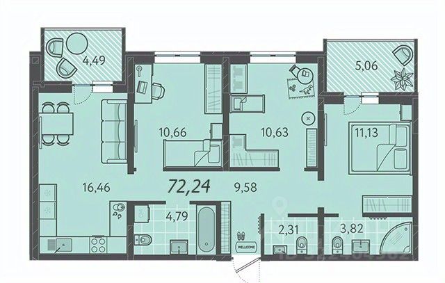 В квартире 3 комнаты правильной формы, одна из них мастер спальня. 3 санузла и 2 просторных балкона.