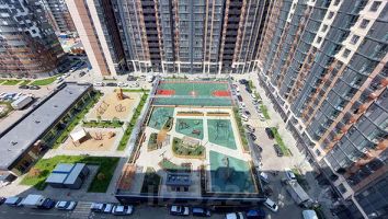 На территории дома обустроен двор-стилобат, где на первом уровне будет находиться крытая парковка, а на втором зоны отдыха с беседками и мангалами, детские и спортивные площадки.