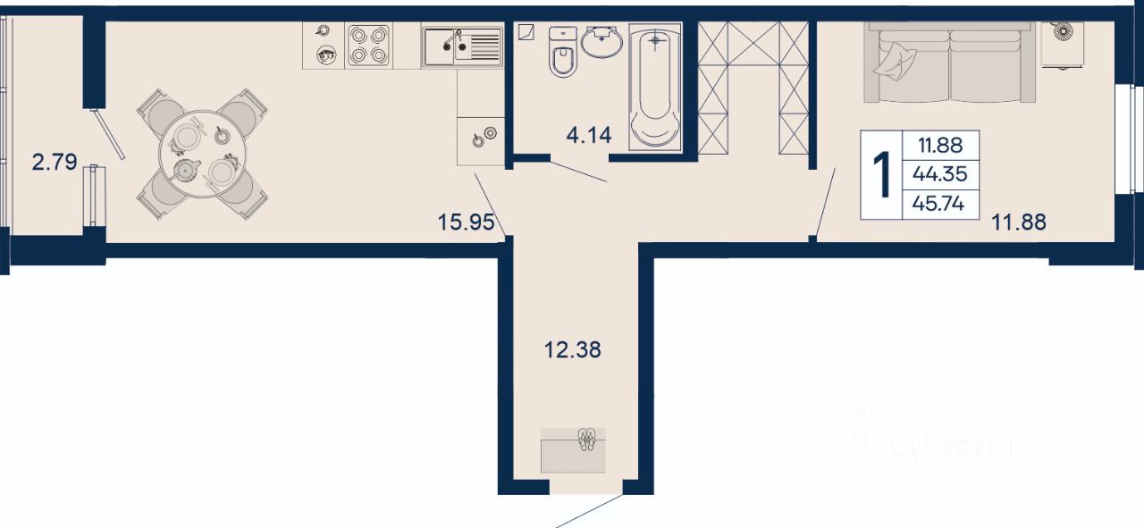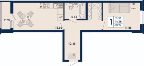 1 комнатная квартира 45.74 м² с ремонтом, на 2 этаже в жилом комплексе "Дом 101".